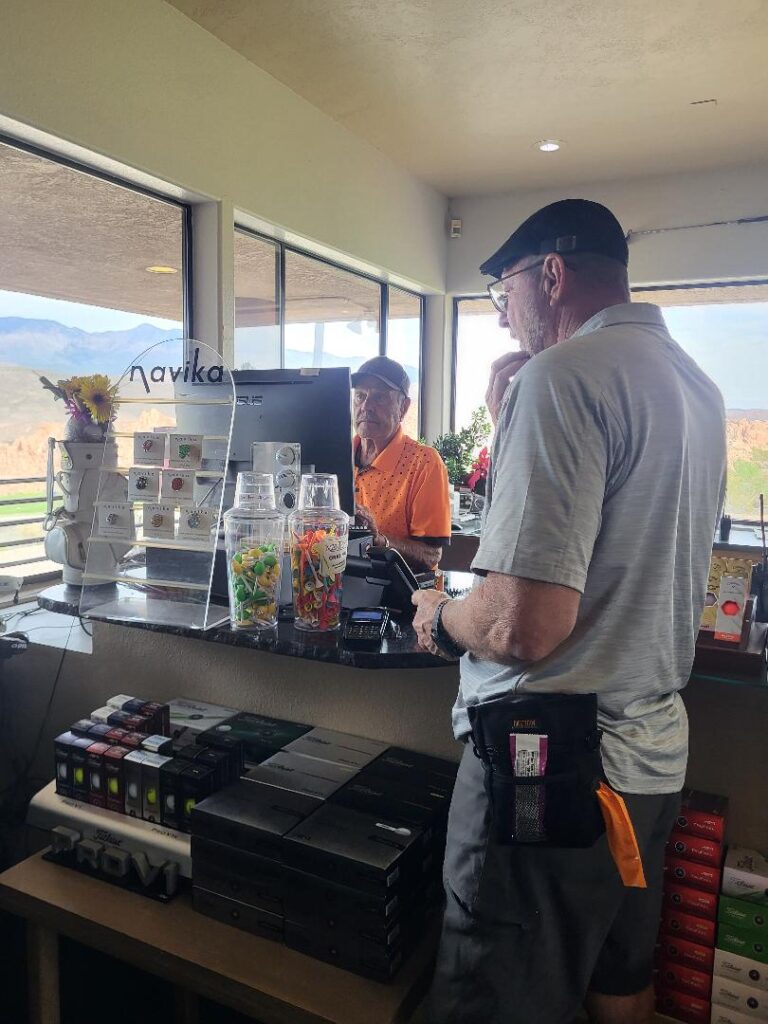 We caught our first peek of the course from the road about 3 minutes out as we were driving in. I don’t know what hole it was, but the dark green grass stood out against the rust colored mountains and brown desert sand. I got excited.